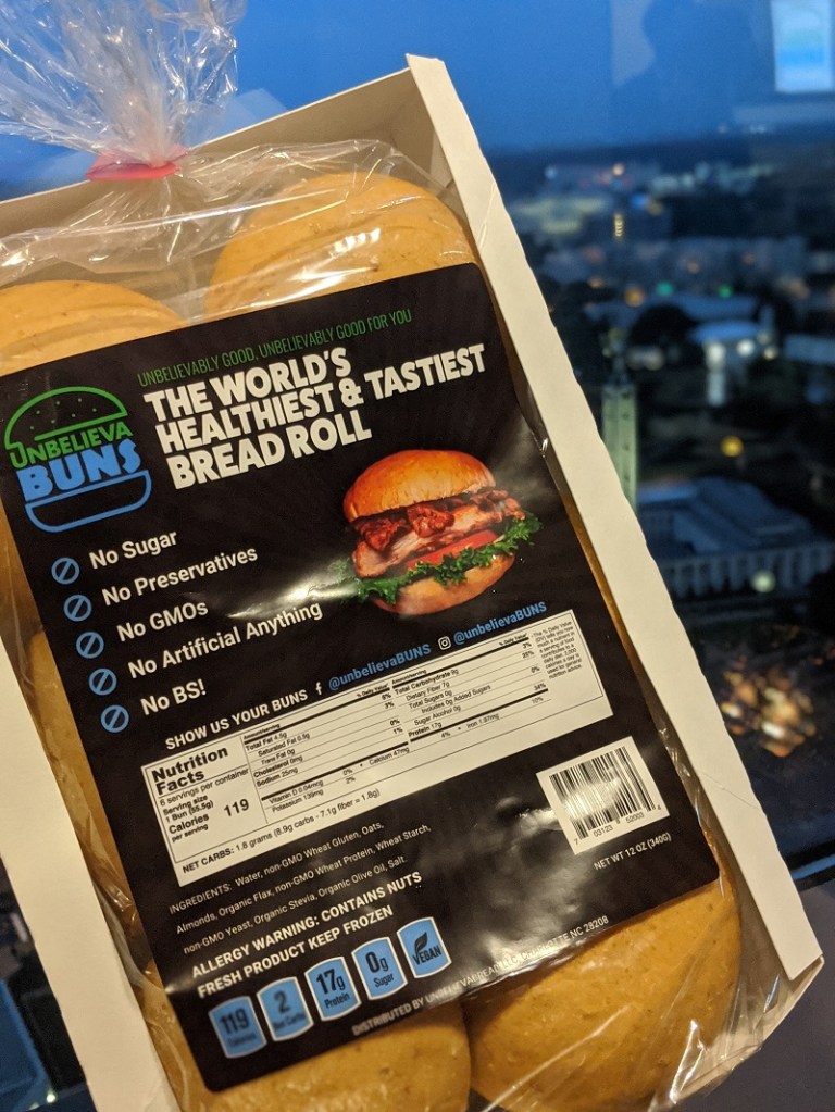 It was also super cool that these buns are to be kept frozen. We were completely skeptical at how they were going to “come back to life” after being frozen–but we followed the instructions and let them thaw out for about 10 minutes and they literally were exactly as they were when Jerrod gave them to us. Considering that the Unbelievabun does not have any preservatives or any other artificial ingredients AND it can be frozen AND STILL come back to its regular state without its taste or texture being affected…that’s some crazy magic! We hate food waste and it’s so annoying to buy a pack of buns and always have 2-4 extra ones that sit on the counter and then mold within a day or so of opening them! Urgh!