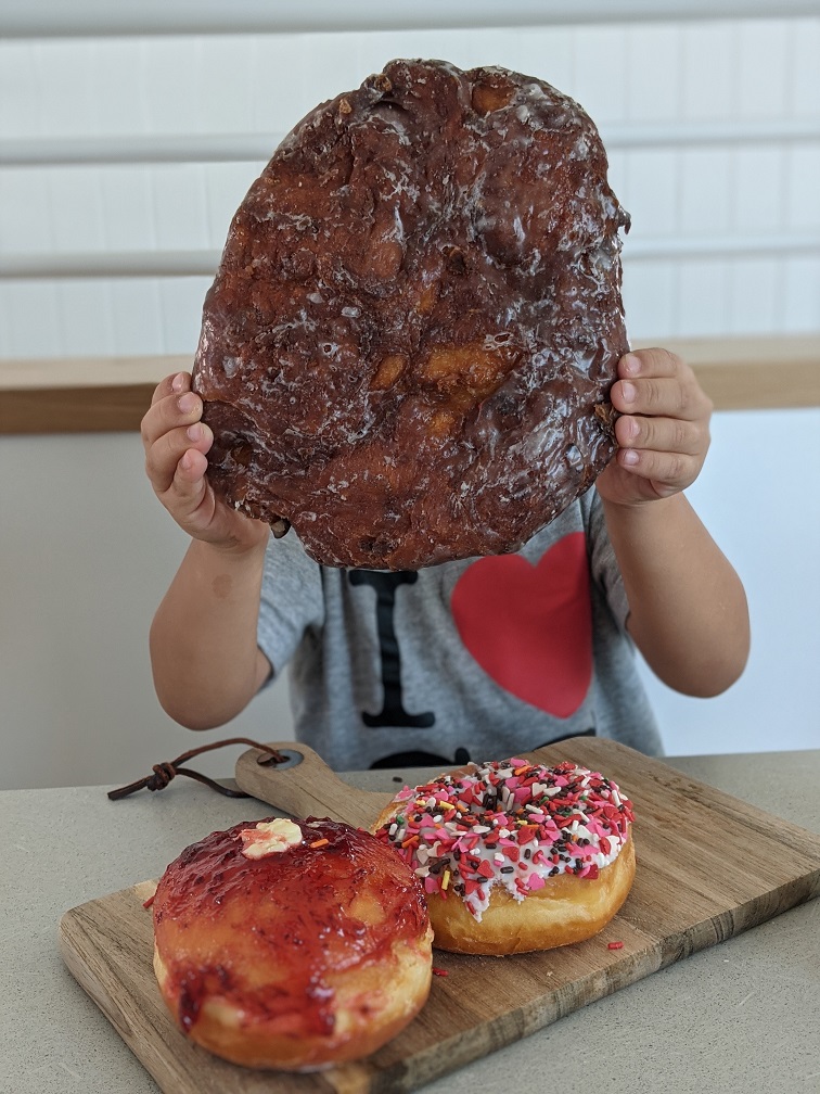 The guys didn’t want any donuts–so I was on a mission to find the little dude a sprinkles donut (his fave) and something for myself. Immediately, the strawberry cheesecake called out my name, but then I saw the gigantic apple fritter. Shawn LOOOVES apple fritters, and while he said he didn’t want anything–I had no choice! I had to get it. Spoiler alert: he was glad I did. LOL!