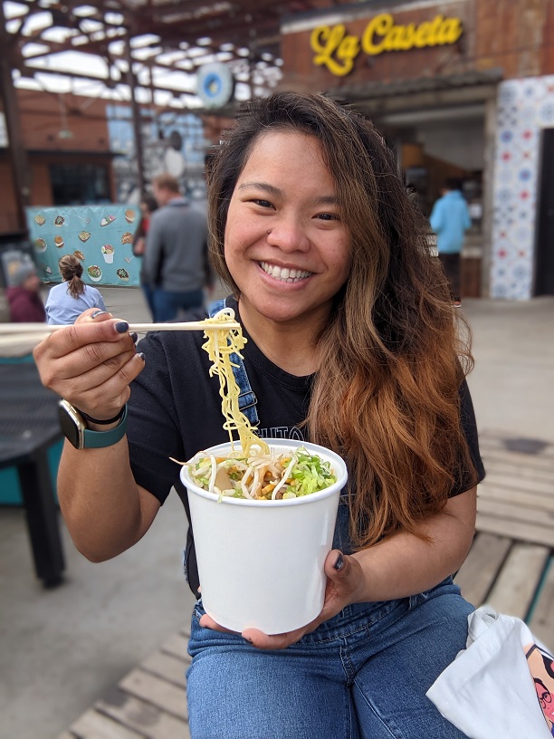 After we’ve snagged some goods, we like to walk some more. Manny got Grayson a kid’s FitBit and he is just as obsessed with us in checking how many steps he has taken in a day, and exploring Camp North End is a great spot for us to get our steps in. It’s also a great way to work up an appetite, and we enjoy that Camp has a lot of dining options now. Keswick Hall has four different food stalls, and they’re all amazing! On this trip, we enjoyed some ramen from Saru. Two pro-tips coming at you: (1) Check the Instagram accounts of each business before making plans to make sure they are open. (2) Always add the black garlic at Saru–it’s an added flavor dimension that will literally take you to Flavor Town!