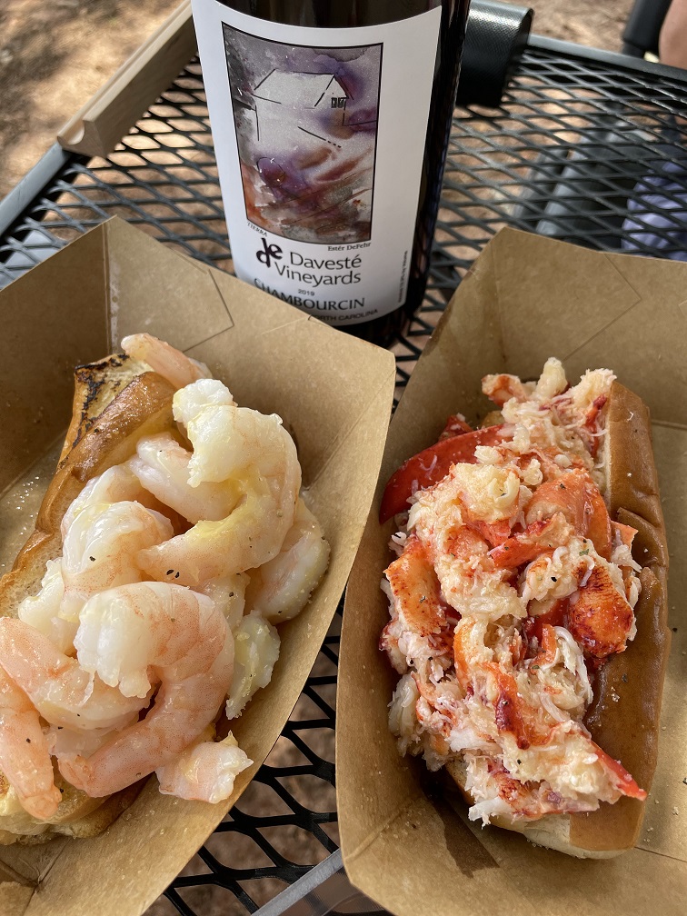 In case you didn’t know, most NC wineries and vineyards will allow you to bring a picnic to enjoy–please check with each one and be mindful of any restrictions (i.e., no outside alcohol, etc.). We usually pack our own charcuterie board/box but since it was kind of an impromptu stop, we just decided to take advantage of their snack selection on this last visit. Lobster Dogs Food Truck was also there, so we decided to give their lobster and shrimp rolls a try!